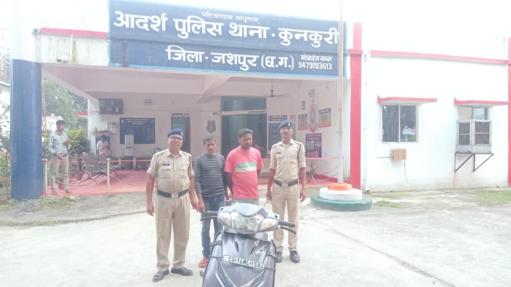 सूचना पर कुनकुरी पुलिस के द्वारा तत्काल कार्यवाही करते हुए, गिना बहार, भट्टी रोड में घेरा बंदी का आरोपी संदीप यादव को व उसके साथी राजकुमार यादव को हिरासत में लिया गया व उनके कब्जे से चोरी की स्कूटी क्र0CG-14ML-1584 को भी बरामद किया गया। पुलिस की पूछताछ पर दोनों आरोपी संदीप यादव व राजकुमार यादव ने अपराध स्वीकार करते हुए बताया कि घटना दिनांक को वे बस में बैठकर चराई डांड आए थे, फिर रात्रि में चोरी करने की नियत से घूम रहे थे, इसी दौरान एक घर में सुनसान होने पर, उनके द्वारा घर में दरवाजे में लगे ताले को तोड़कर, घर के अंदर से स्कूटी की चाभी को निकाल कर, चोरी कर ले गए थे। आरोपियों के द्वारा अपराध स्वीकार करने व प्रयाप्त अपराध सबूत पाए जाने पर, उन्हें विधिवत गिरफ्तार कर न्यायिक रिमांड पर जेल भेजा गया है। यहां यह बताना आवश्यक है कि दोनों आरोपी संदीप यादव व राजकुमार यादव, आदतन अपराधी हैं, इनके विरुद्ध थाना कुनकुरी सहित नारायणपुर, तपकर , व जशपुर में भी चोरी, लूट, मारपीट इत्यादि के कई प्रकरण दर्ज हैं, तथा कई प्रकरणों में पूर्व में भी जेल जा चुके हैं। मामले की कार्यवाही व आरोपियों की गिरफ्तारी में थाना प्रभारी कुनकुरी निरीक्षक राकेश कुमार यादव, प्रधान आरक्षक दलेश्वर यादव, आरक्षक नंदलाल यादव व राजकुमार यादव की महत्वपूर्ण भूमिका रही है। मामले में वरिष्ठ पुलिस अधीक्षक जशपुर शशि मोहन सिंह ने बताया कि कुनकुरी क्षेत्र में एक स्कूटी की चोरी के मामले में दो आरोपियों को गिरफ्तार कर जेल भेजा गया है। व चोरी की स्कूटी को भी बरामद कर लिया गया है।