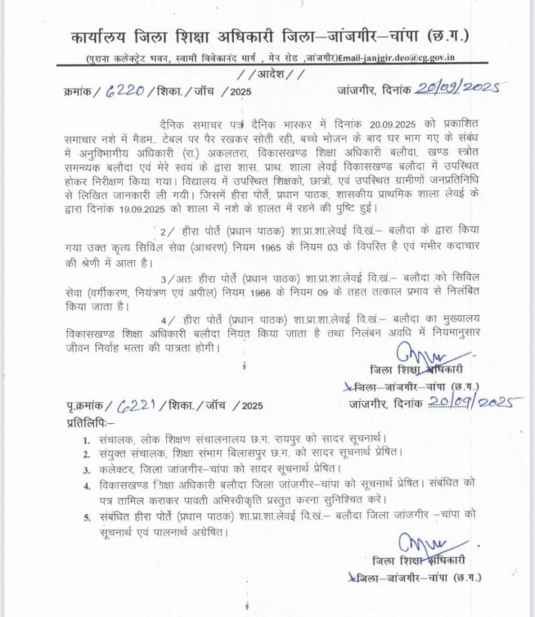 कलेक्टर ने जिला शिक्षा अधिकारी को निर्देश दिया है कि ऐसे आदतन नशेड़ी शिक्षकों और कर्मचारियों पर सख्त कार्रवाई की जाए। उन्होंने स्पष्ट कहा कि शिक्षा व्यवस्था की मर्यादा और विद्यार्थियों के भविष्य से खिलवाड़ करने वालों को किसी भी हाल में बख्शा नहीं जाएगा।