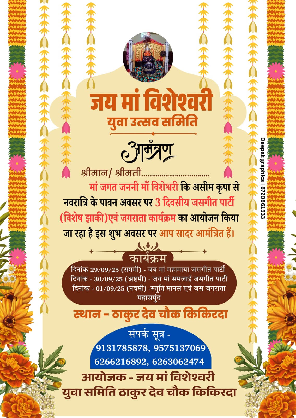 बिर्रा – चित्रोत्पला महानदी के तट पर स्थित किकिरदा में तीन दिवसीय जसगीत एवं जगराता कार्यक्रम का आयोजन 29 से प्रारंभ होगा जिसमें विशेष झांकी के प्रस्तुति देंगे। गौरतलब है कि जैजैपुर ब्लॉक के किकिरदा में जय मां विशेश्वरी युवा समिति द्वारा 3 दिवसीय जसगीत एवं जगराता कार्यक्रम का आयोजन किया जा रहा है,