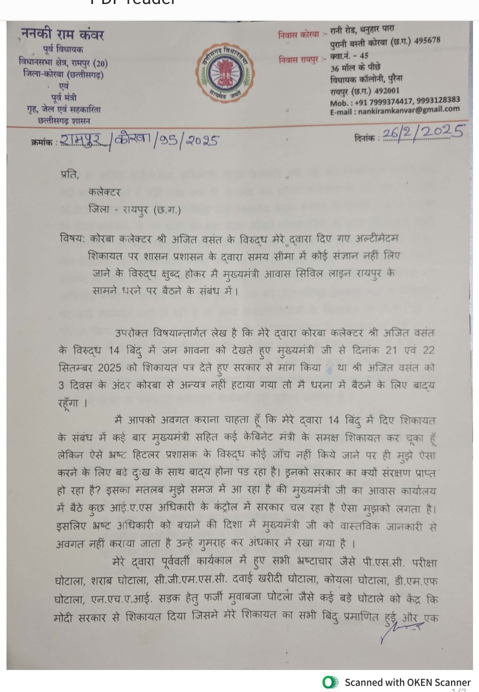 इस बार उन्होने रायपुर कलेक्टर को पत्र लिखकर धरने पर बैठने की जानकारी से अवगत कराया है। ननकीराम कंवर द्वारा लिखे गये पत्र में उन्होने आरोप लगाया है कि उनके द्वारा पूर्ववर्ती कांग्रेस सरकार में हुए शराब, कोयला, सीजीएमएससी में दवा की खरीदी और पीएससी भर्ती घोटाले का खुलासा किया गया। इस मामले में शिकायत के बाद इस भ्रष्टाचार में लिप्त दोषी आईएएस अफसर व नेताओं की गिरफ्तारी की गयी। लेकिन कोरबा कलेक्टर को लेकर किये जा रहे शिकायतों पर अब तक किसी भी तरह से संज्ञान नही लिया जाना, स्पष्ट प्रमाण है कि मुख्यमंत्री जी को अधिकारी कब्जे में रखकर गुमराह करके रखे हुए है।