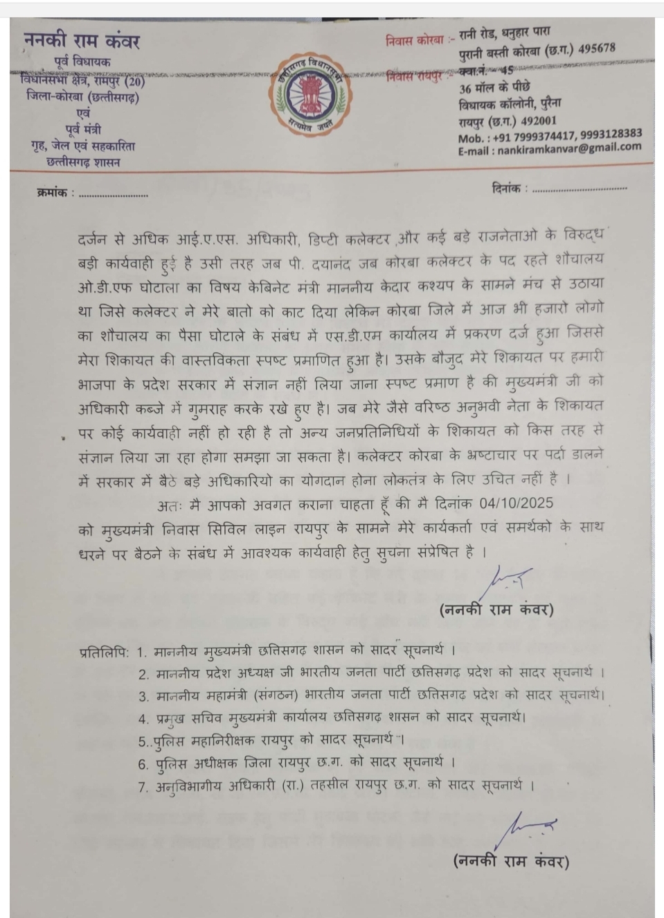 September 27, 2025कोरबा । भारतीय जनता पार्टी के सीनियर आदिवासी नेता और पूर्व गृहमंत्री ननकीराम कंवर ने सरकार की टेंशन बढ़ा दी है। कोरबा कलेक्टर को हटाने की मांग को लेकर उन्होने मुख्यमंत्री निवास के सामने समर्थकों के साथ धरने पर बैठने का ऐलान किया है। रायपुर कलेक्टर को लिखे पत्र मंे उन्होने आरोप लगाया है कि कोरबा कलेक्टर को तीन दिन के भीतर हटाने की मांग की थी। लेकिन इस अल्टीमेटम के बाद भी उनकी शिकायत पर कोई संज्ञान नही लिया गया, जिससे क्षुब्द्ध होकर अब वे मुख्यमंत्री निवास के सामने धरने पर बैठेंगे।