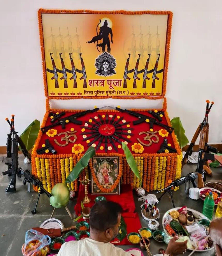 विजयादशमी पर्व के अवसर पर दिनांक 02 अक्टूबर 2025 को रक्षित केंद्र मुंगेली में पुलिस विभाग द्वारा पारंपरिक शस्त्र पूजा का आयोजन किया गया। हर वर्ष की तरह इस बार भी पुलिस विभाग ने दशहरा पर्व को विधि-विधान के साथ मनाते हुए शस्त्र,वाहन और उपकरणों की पूजा अर्चना की।