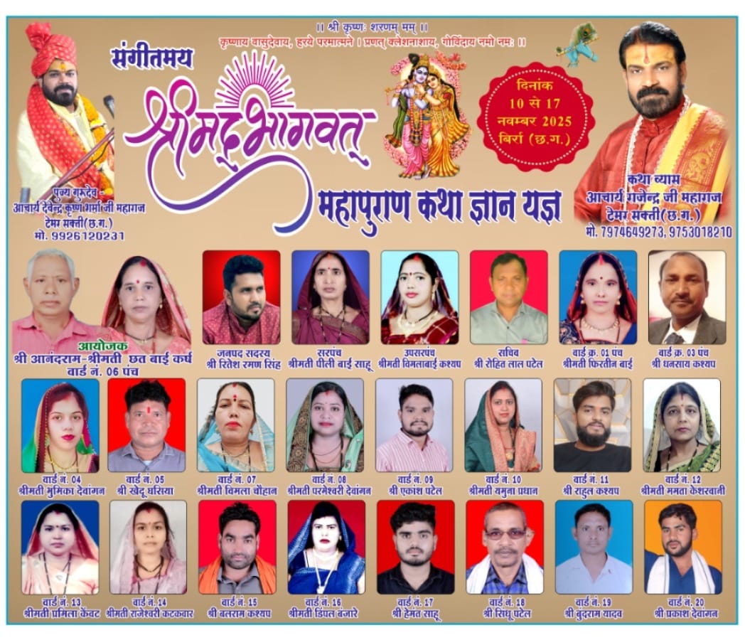 बिर्रा – मां चंडी देवी की पावनधरा दाऊ मुहल्ला बिर्रा में स्मृति शेष विष्णु कर्ष (सीएएफ आरक्षक)व स्मृति शेष विक्रम कर्ष के पावन स्मृति (वार्षिक श्राद्ध) निमित्त मोक्ष कामार्थ संगीतमय श्रीमद् भागवत कथा का शुभारंभ 10 नवंबर को भव्य कलशयात्रा शोभायात्रा के साथ होने जा रहा है।