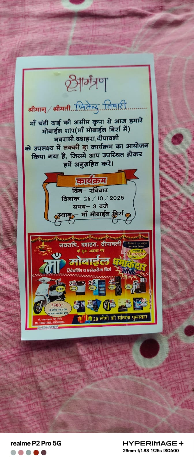 अपने ग्राहकों को नवरात्रि दशहरा दीपावली के पावन अवसर पर एक बेहतरीन आफर के तहत् 7500 से अधिक की खरीदी पर दीपावली बोनांजा आफर दिया गया था जिसका लक्की ड्रॉ आज रविवार शाम 3 बजे अपने प्रतिष्ठान मां मोबाइल रिपेयरिंग शाप एसेसरीज चांपा रोड में किया जाएगा।