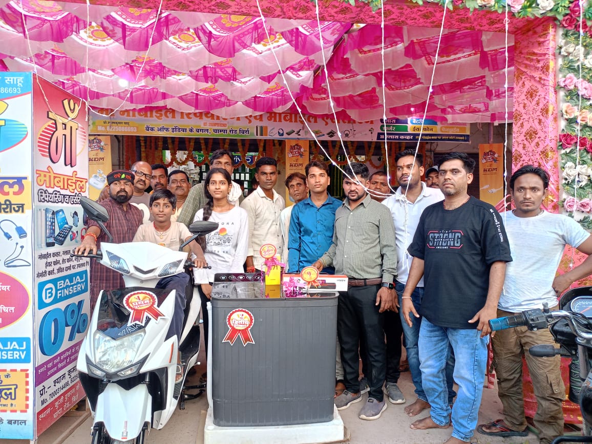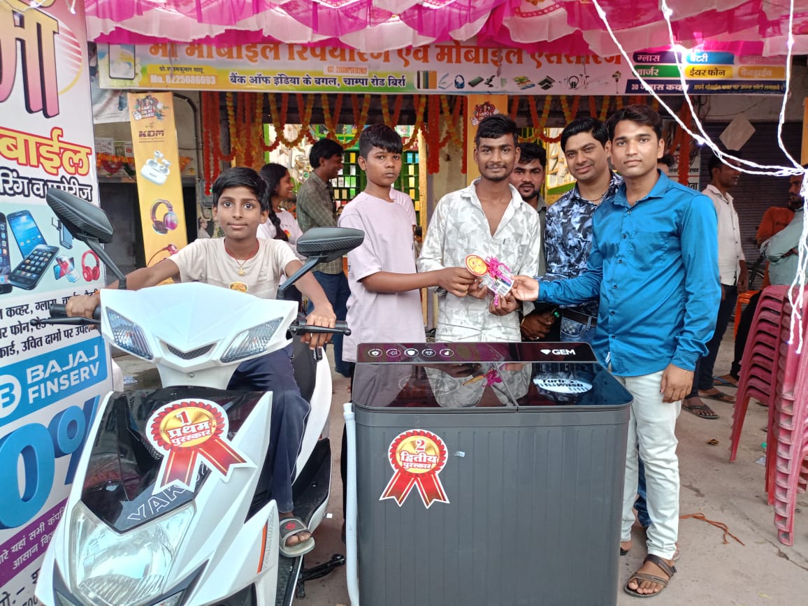 सहित बड़ी संख्या में बिर्रा,तालदेवरी सेमरिया बोरसी करनौद नक्टीडीह ठाकूरदीया मुक्ता जमडी मल्दा किकिरदा सोनादह केरा सहित क्षेत्र के ग्राहक जिन्होंने खरीदी की उपस्थित थे। लक्की ड्रॉ में सभी ग्राहकों का चिठ्ठा एक डिब्बे में रखकर सभी के सामने नन्हे मुन्ने बच्चों द्वारा चिट्ठा निकाला और और नाम की घोषणा की गई। जिसमें प्रमुख 10 मुख्य पुरस्कार लक्की ड्रॉ विजेताओं को इलेक्ट्रिक स्कूटी , वाशिंग मशीन,रियल मी मोबाइल, ब्लूटूथ स्पीकर,मिक्सी,की पैड व जियो मोबाइल, स्मार्ट वॉच आदि 10 प्रमुख उपहार व अन्य 20 लोगों को सांत्वना पुरस्कार प्रदान किया गया। प्रथम विजेता इलेक्ट्रिक स्कूटी का पुरस्कार महाकाल की नगरी जमड़ी से रामविलास कश्यप को मां मोबाइल रिपेयरिंग एंड एसेसरीज के संचालक श्याम कुमार साहू के पिताजी के हाथों चाबी सौंपी गई।आज के इस भव्य आयोजन में क्षेत्रीय जनप्रतिनिधि सहित ग्राहक उपस्थित थे। बिर्रा क्षेत्र में उपहार योजना का यह मां मोबाइल शाप का दूसरा अवसर से क्षेत्रीय ग्रामीणों में हर्ष का वातावरण रहा।