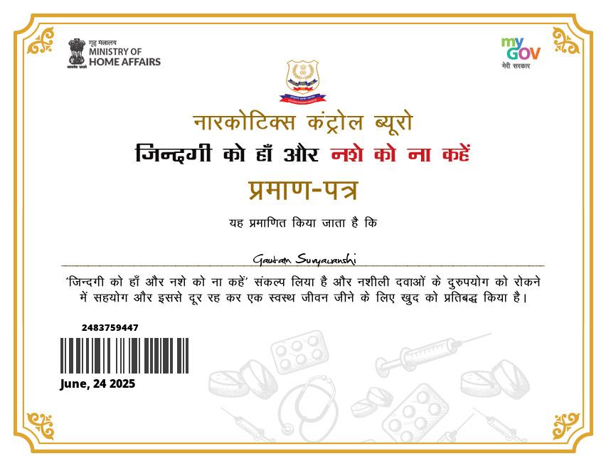 जशपुर। मिनिस्ट्री ऑफ होम अफेयर व समाज कल्याण विभाग के द्वारा नशा मुक्त भारत अभियान के तहत् नशा के खिलाफ जागरूकता पखवाड़ा का आयोजन किया गया था, जिसके तहत जशपुर पुलिस के द्वारा वरिष्ठ पुलिस अधीक्षक जशपुर श्री शशि मोहन सिंह के दिशा निर्देश पर, विगत 15 दिवस में लगातार चलाए जा रहे, आम नागरिकों को नशे के खिलाफ जागरूक करने हेतु “*नशा मुक्त भारत पखवाड़ा अभियान*” का 26.06.2025 को अंतरास्ट्रीय नशा निवारण दिवस के अवसर पर समापन किया गया,इस दौरान पुलिस के द्वारा जिले के सभी थाना/ चौकी क्षेत्र के बाजार -हाटों, स्कूल-कॉलेज, व सार्वजनिक स्थानों में जाकर, विशेष कार्यक्रम का आयोजन कर, आम नागरिकों व विद्यालयीन छात्र छात्राओं को, नशे के दुरुपयोग के सम्बन्ध में जागरूक करते हुए, नशे से दूर रहने, नशीली दवाओं के दुरुपयोग को रोकने में सहयोग करने, नशे को ना, जिंदगी को हां कहने ,शपथ दिलाई गई, साथ ही प्रमाण पत्र भी प्रदाय किया गया।