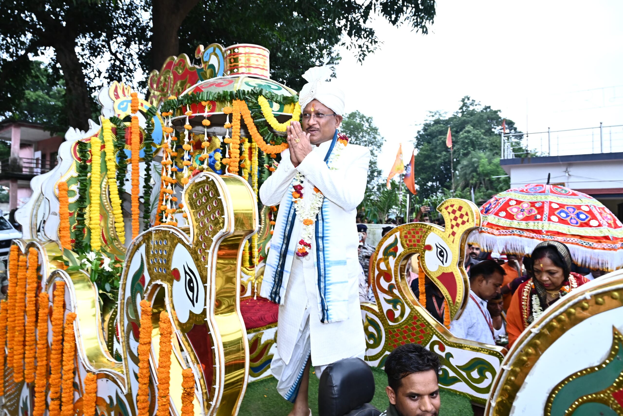 मुख्यमंत्री श्री साय ने हजारों श्रद्धालुओं के साथ भक्तिभावपूर्वक रथ यात्रा में भाग लिया। श्रद्धालुओं ने भगवान श्री जगन्नाथ, भाई बलभद्र एवं बहन सुभद्रा के रथ को रस्सी खींचकर आगे बढ़ाया। पूरा वातावरण जय जगन्नाथ के जयघोष, भजन-कीर्तन और भक्तिमय उल्लास से गूंज उठा। रथ यात्रा मुख्य मार्गों से होते हुए मौसीबाड़ी पहुंची। भगवान श्री जगन्नाथ, भाई बलभद्र एवं बहन सुभद्रा नौ दिनों तक अपनी मौसी के घर मौसीबाड़ी में विराजमान रहेंगे। नौवें दिन 5 जुलाई को शुभ वापसी श्री जगन्नाथ मंदिर, दोकड़ा में होगी। यह आयोजन ओडिशा के पुरी धाम की परंपरा के अनुरूप आयोजित किया गया है।