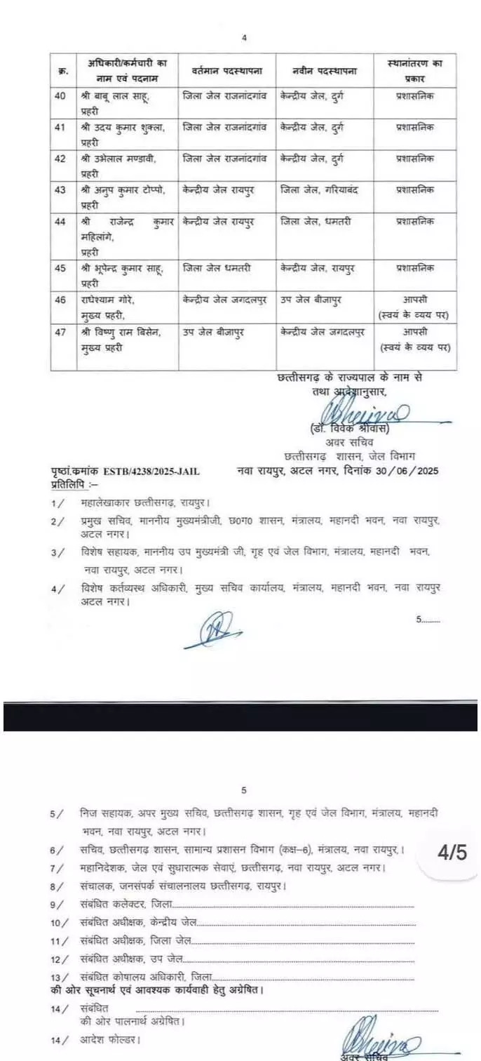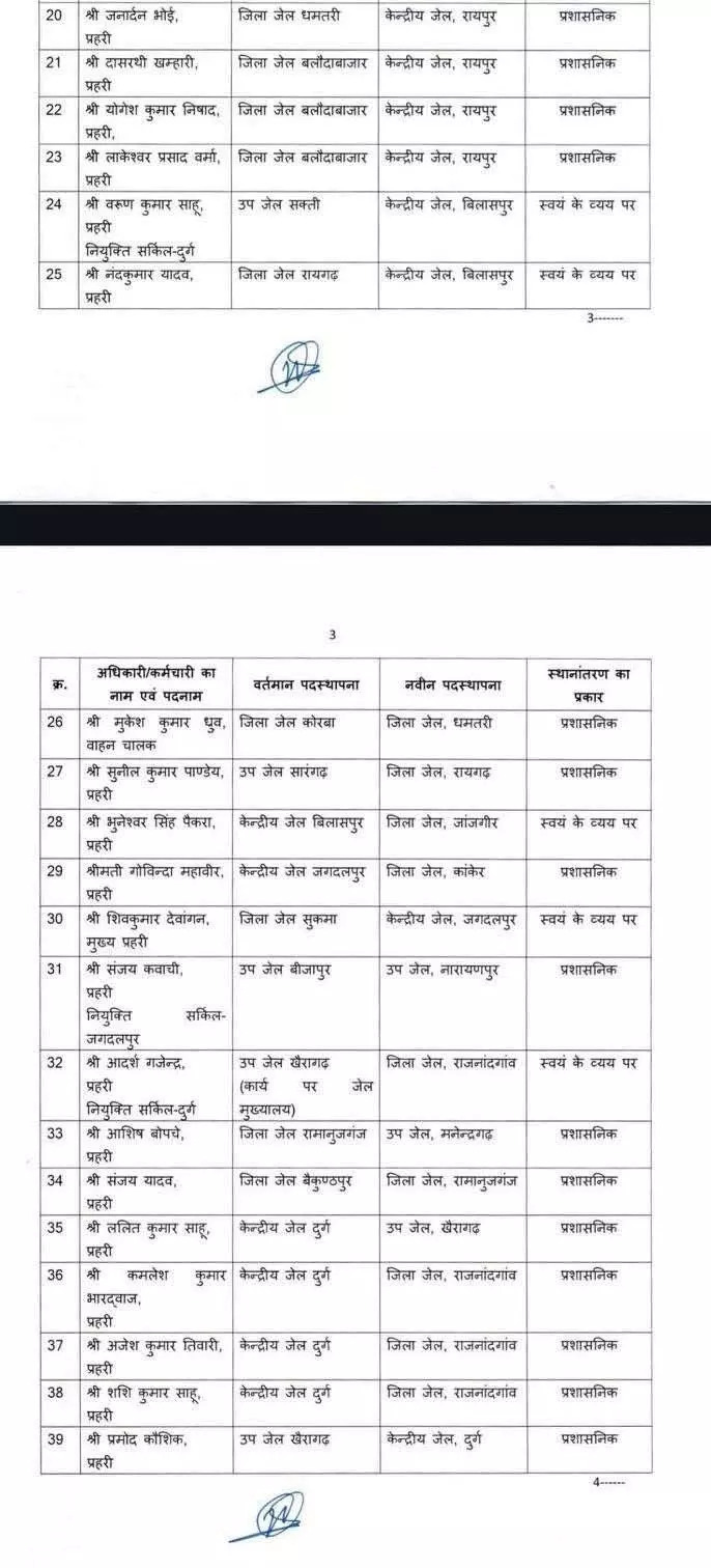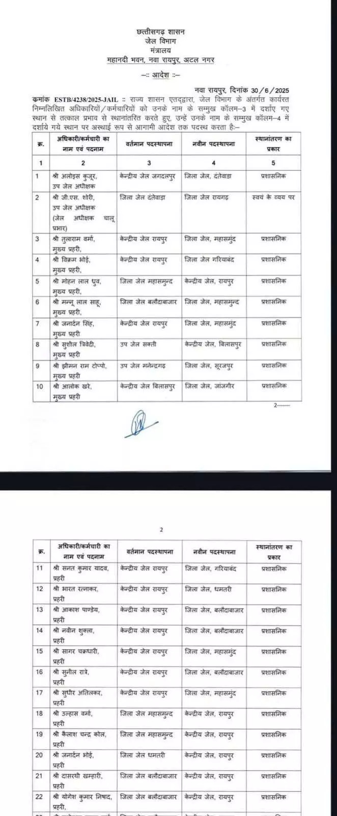 July 2, 2025रायपुर।जेल प्रशासन विभाग ने एक अहम निर्णय लेते हुए केंद्रीय जेल रायपुर सहित राज्य की विभिन्न उप जेलों में पदस्थ अधिकारियों और कर्मचारियों का तबादला आदेश जारी किया है।यह तबादले प्रशासनिक जरूरतों और विभागीय संतुलन को ध्यान में रखते हुए किए गए हैं। जारी सूची में जेल अधीक्षक से लेकर सहायक अधीक्षक और प्रहरी स्तर तक के कई कर्मी शामिल हैं, जिन्हें नई जगहों पर पदस्थ किया गया है।