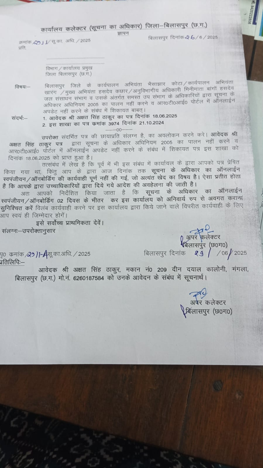 बिलासपुर अपर कलेक्टर ने अक्षत सिंह ठाकुर (पत्रकार) की शिकायत पर मामले को लिया संज्ञान RTI (आर टी आई) कानून का उल्लंघन करने वाले अधिकारियों को लिखित में लगाई फटकार जारी किया पत्र ,,,,