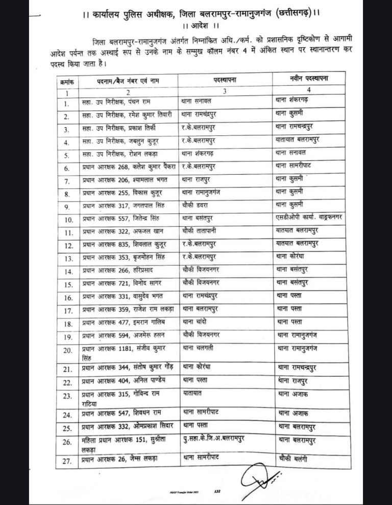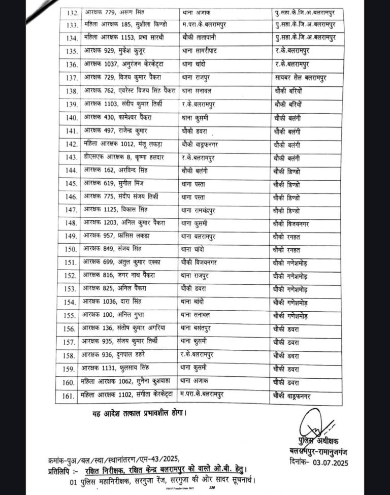 July 5, 2025बलरामपुर। जिले में पुलिस विभाग में एक बार फिर बड़े पैमाने पर प्रशासनिक सर्जरी हुई है। बलरामपुर एसपी वैभव बैंकर ने प्रशासनिक दृष्टिकोण और विभागीय संतुलन को ध्यान में रखते हुए कुल 161 पुलिसकर्मियों का तबादला आदेश जारी किया है।