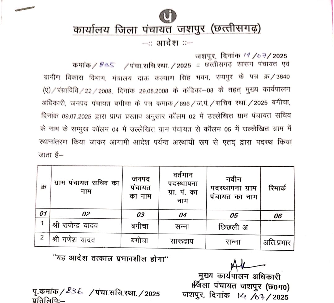 मामले की गंभीरता को देखते हुए जिला पंचायत सीईओ ने तुरंत संज्ञान लिया और सीईओ जनपद के पत्र पर सचिव राजेन्द्र यादव को सन्ना पंचायत से हटाकर छिछली अ पंचायत में पदस्थ कर दिया है। साथ ही गणेश यादव को सारुढाब पंचायत के साथ-साथ सन्ना पंचायत का अतिरिक्त प्रभार सौंपा गया है।