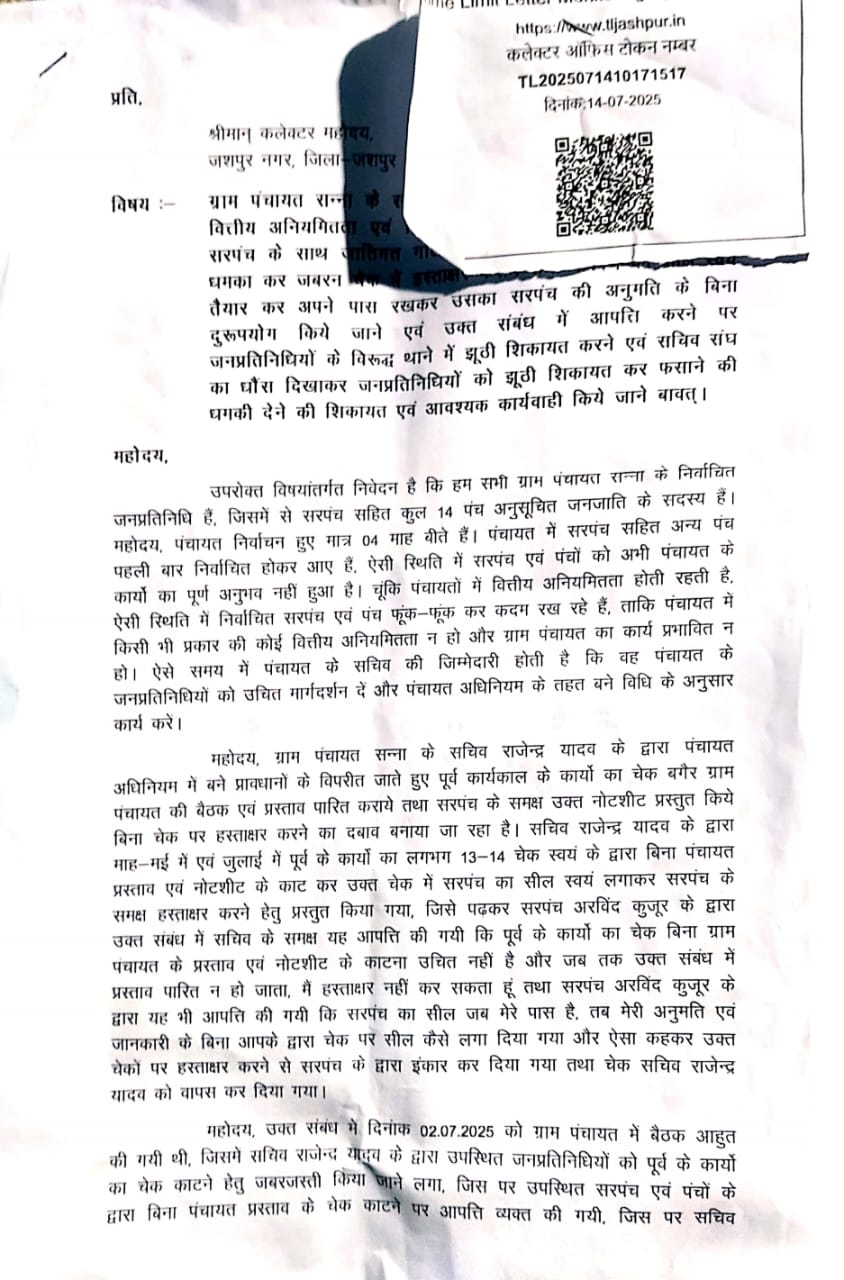 सार्वजनिक रूप से प्रस्तुत शिकायत में सरपंच अरविंद कुजूर और पंचायत के पंचों ने आरोप लगाया कि सचिव राजेन्द्र यादव —