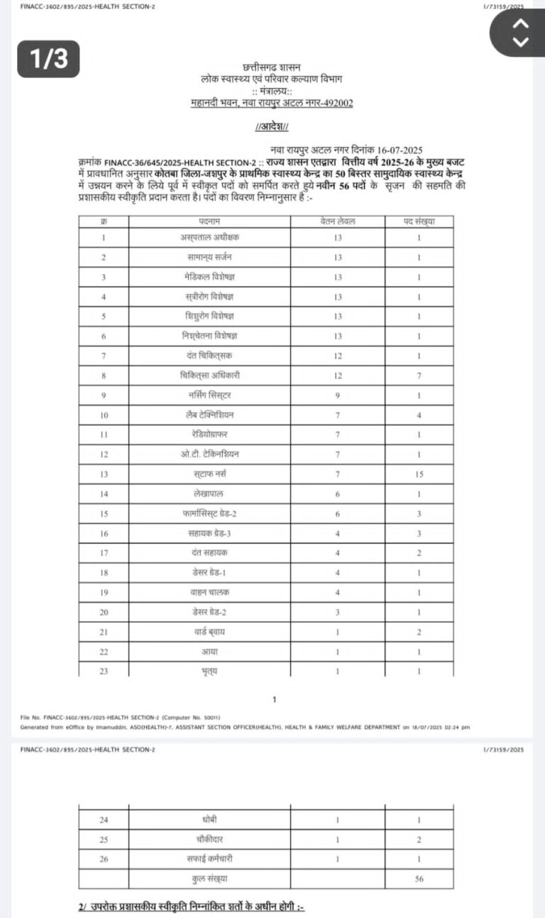 मुख्यमंत्री के विशेष प्रयास से कोतबा सामुदायिक स्वास्थ्य केंद्र के लिए 56 पदों की मिली स्वीकृति, अस्पताल अधीक्षक, सर्जन, मेडिकल विशेषज्ञ, स्त्री रोग विशेषज्ञ, शिशु रोग विशेषज्ञ, चिकित्सा अधिकारी सहित अन्य पदों को शीघ्र भरा जाएगा