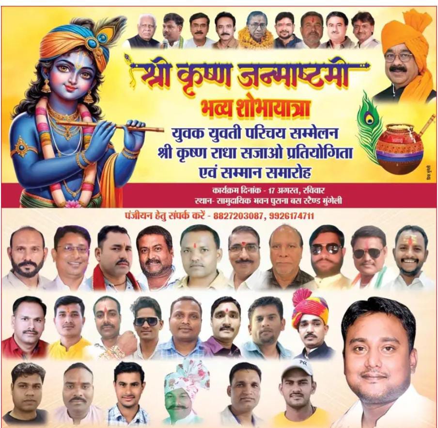 मुंगेली/- श्री कृष्ण जन्माष्टमी महोत्सव आयोजन समिति जिला यादव समाज मुंगेली के तत्वाधान में श्री कृष्ण जन्माष्टमी महोत्सव का आयोजन बड़े धूमधाम से किया गया है। जिसमें आज जीवंत राधाकृष्ण की झांकी के साथ ही पारंपरिक गड़वा बाजा के साथ रावत नृत्य, विशेष झांकियों के साथ हरि कीर्तन टोली, डीजे धुमाल और सबसे बड़ा विशेष आकर्षण मध्यप्रदेश से आए हुए दलों के द्वारा शिव तांडव नृत्य और अघोरी अखाड़ा सहित अघोरी नृत्य का प्रदर्शन विशेष रूप से प्रमुख चौक चौराहा पर किया जाएगा। जिसे देखने के लिए नगर में लोग बड़े उत्साहित हैं और आसपास के गांव से तथा पूरे जिले से बड़ी संख्या में यादव जन भाग लेने पहुंच रहे हैं।