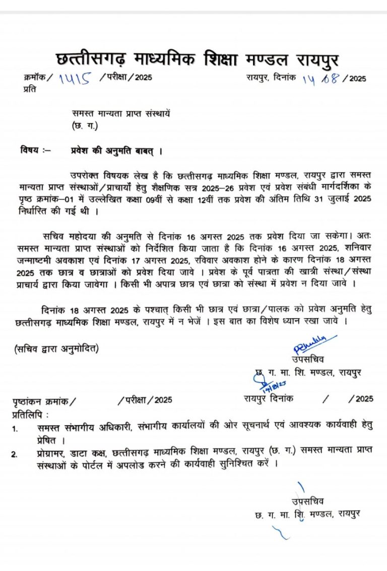 August 17, 2025रायपुर। स्कूलों में बच्चों को दाखिला अब 18 अगस्त तक मिल सकेगा। इस संबंध में सभी स्कूलों को निर्देश जारी कर दिया गया है। जारी आदेश के मुताबिक 9वीं से 12वीं तक एडमिशन की अंतिम तिथि पहले 31 जुलाई तक रखी गयी थी।