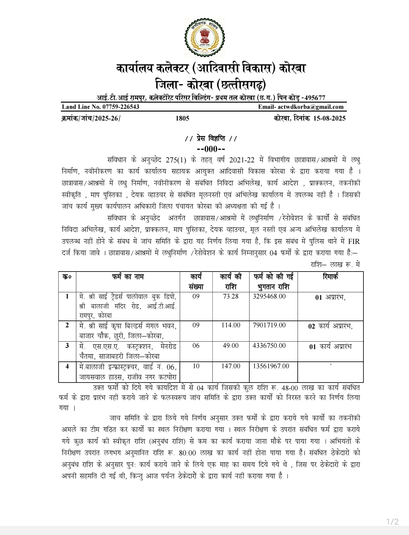 कलेक्टर अजीत वसंत के निर्देश पर हुए जांच में पाया गया कि छात्रावास मरम्मत और नवीनीकरण के नाम पर ठेका कंपनियों को जमकर फायदा पहुंचाया गया है। करीब 3 करोड़ 83 लाख 28 हजार रूपये के 34 निविदा कार्यो को आबंटन सिर्फ 4 ठेका कंपनियों को दिया गया। इनमें मेसर्स श्री साई ट्रेडर्स को 73.28 लाख रूपये के 9 कार्य, मेसर्स श्री साई कृपा बिल्डर्स को एक करोड़ 14 लाख रूपये के 9 कार्य, मेसर्स एस.एस.ए.कंस्ट्रक्शन को 49 लाख रूपये के 6 कार्य और मेसर्स बालाजी इंफ्रास्ट्रक्टर कटघोरा को 1 करोड़ 47 लाख रूपये के 10 कार्य आबंटित किये गये। लेकिन जांच में इन सारे 34 निविदा और भुगतान से संबंधित एक भी दस्तावेज कार्यालय में नही मिल सके। वहीं भौतिक सत्यापन में करीब 80 लाख रूपये के ऐसे कार्य मिले, जिनका कार्य कराये बगैर ही कागज में कार्य पूर्ण बताकर ठेका कंपनियों को बोगस पेमेंट कर दिया गया।