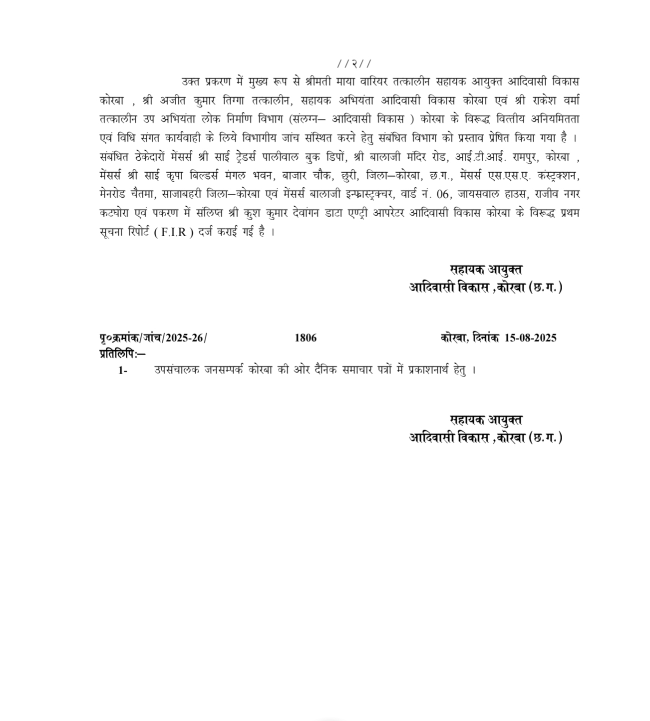 कोरबा में आदिवासी विकास विभाग में हुए इस भ्रष्टाचार के मामले में करीब 2 साल से चल रहे जांच में अब विभाग ने एफआईआर कराया है। विभाग से जारी पत्र में बताया गया है कि मुख्य कार्यपालन अधिकारी जिला पंचायत की अध्यक्षता में इस भ्रष्टाचार की जांच की गयी। जांच में पाया गया कि अनुच्छेद 275 (1) के तहत मिली राशि से कराये गये कार्यो से संबंधित निविदा अभिलेख, कार्य ओदश, प्राक्कलन, तकनीकि स्वीकृति, माप पुस्तिका, देयक व्हाउचर से संबंधित मूल नस्ती एवं अभिलेख कार्यालय में उपलब्ध नही मिलें। वहीं जांच में 48 लाख के 4 कार्य आज तक अप्रारंभ मिले, जबकि 80 लाख रूपये के फर्जी भुगतान बगैर कार्य कराये फर्मो को किये गये। इन सारे खुलासे के बाद आदिवासी विभाग के सहायक आयुक्त श्रीकांत कसेर ने कलेक्टर अजीत वसंत के निर्देश पर तत्कालीन सहा.आयुक्त माया वारियर, विभाग के तत्कालीन एसडीओं अजीत कुमार तिग्गा, तत्कालीन उप अभियंता राकेश वर्मा के खिलाफ कार्रवाई के लिए सचिव को पत्र लिखा गया है। सचिव से आदेश के बाद जवाबदार अधिकारियों के खिलाफ जहां वैधानिक कार्रवाई का एक्शन लिया जायेगा। वहीं कलेक्टर के आदेश पर 4 फर्मो और आदिवासी विकास विभाग के डाटा एंट्री आपरेटर कुश कुमार देवांगन के खिलाफ थाने में एफआईआर दर्ज किया गया है।