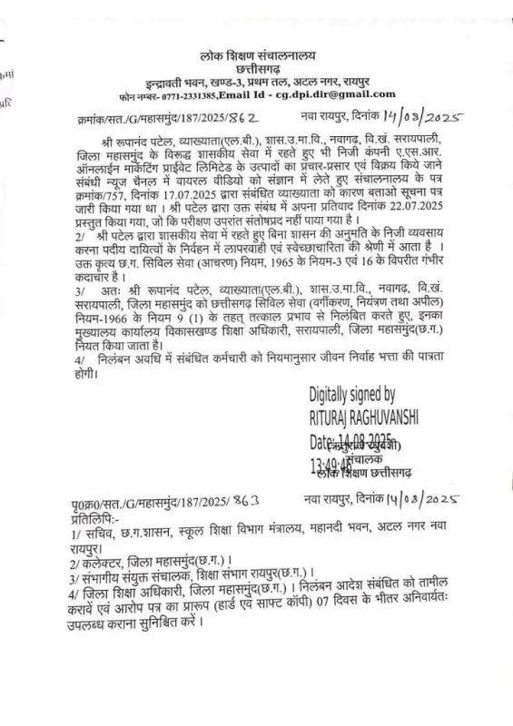 August 17, 2025महासमुंद। छत्तीसगढ़ के महासमुंद जिले के नवागढ़ स्थित शासकीय उच्चतर माध्यमिक विद्यालय में पदस्थ शिक्षक रूपानंद पटेल को शासकीय सेवा नियमों के उल्लंघन के चलते निलंबित कर दिया गया है। उन पर आरोप है कि वे शासकीय पद पर रहते हुए एक निजी कंपनी ASR ऑनलाइन मार्केटिंग के प्रचार-प्रसार में सक्रिय रूप से शामिल थे।
