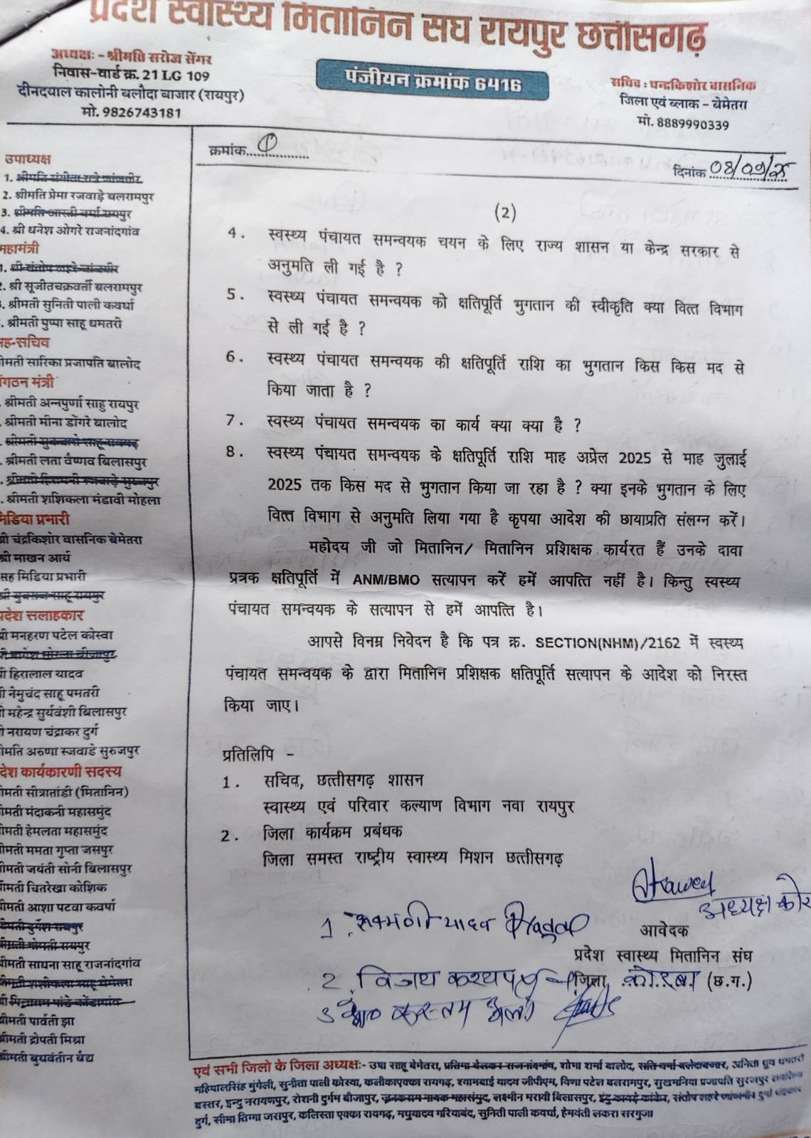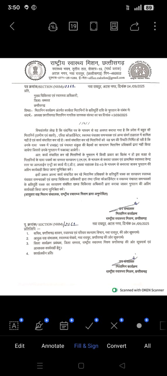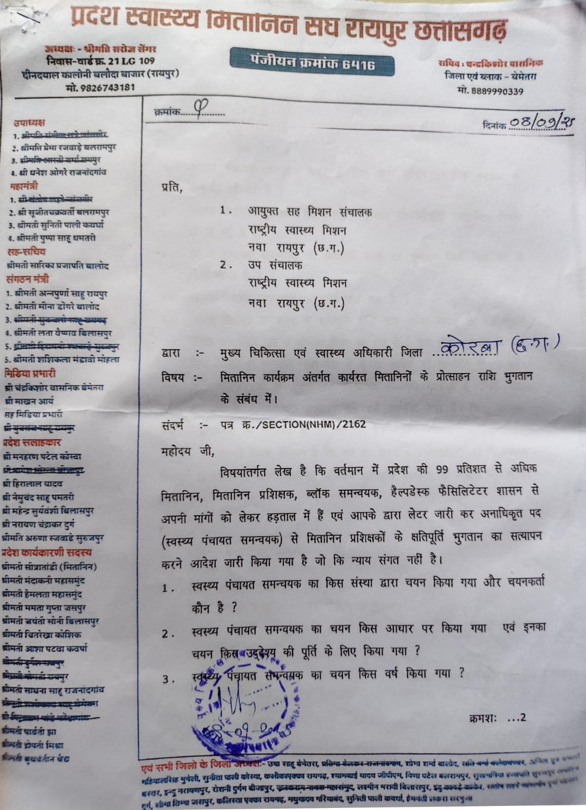 राज्य संसाधन के पत्र क्रमांक स सेक्शन (एन एच एम) 2162 नवा रायपुर 04/092025 के संदर्भ में जिला के मितानिनो ने जिला चिकित्सा अधिकारी को ज्ञापन में लिखा है कि मितानिन 7 अगस्त से प्रदेश व्यापी हड़ताल पर है प्रदेश के मितानिन, मितानिन प्रशिक्षक ब्लॉक समन्वयक, हेल्थ डेस्क फैसलिटेटर शासन से अपनी मांगों को लेकर हड़ताल में है एन एच एम के द्वारा पत्र जारी कर अनाधीकृत पद स्वस्थ पंचायत समन्वयक से मितानिन प्रशिक्षकों के क्षतिपूर्ति भुगतान का सत्यापन करने आदेश जारी किया है.